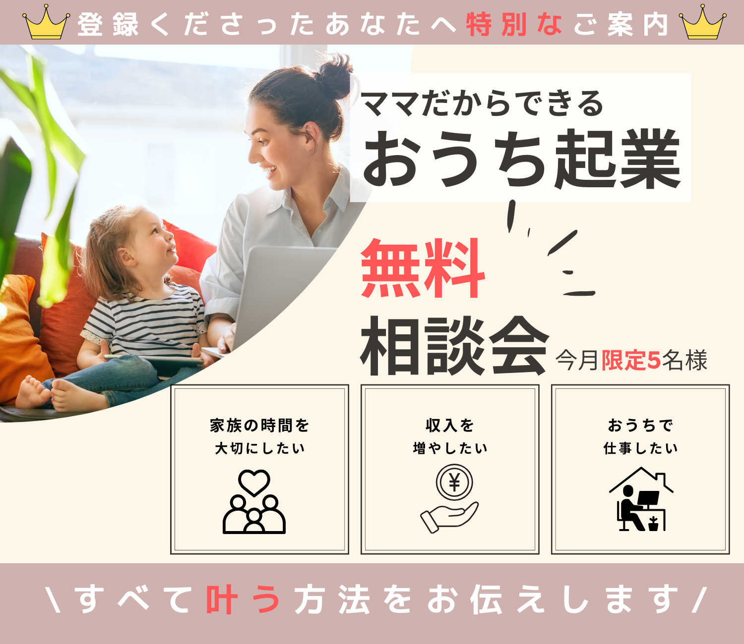 子どもの成長にとって大事な時期を、一緒に過ごせないなんていやだ!と思い、在宅でしっかり稼げるようになりたいと強く思いまた。